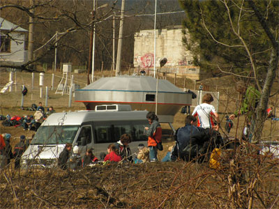 И тут все стало на свои места. Утро в Киеве выдалось тяжелым. Голова оторвалась от подушки с трудом. Вовчик, подумав "Как хорошо, что Сел пошел спать на 2-ю полку", чуть не упал с нее сам. В Киеве мы увидели мальцев, которые штурмовали мост черед Днепр по опорам. Потом мы нашли лагерь бастующих и решили, что у них все как у нас: и маркировка, и пакеты для мусора, и перевозные туалеты, и бейджики у организаторов, и ларек с необходимой продукцией, и палатки и по флагу у каждой команды. Подумалось, что у них доже должен быть Республиканский Календарь забастовок. Границу пересекли без происшествий, хотя они очень даже могли быть, так как неосторожно затеяли игру в карты на вино.