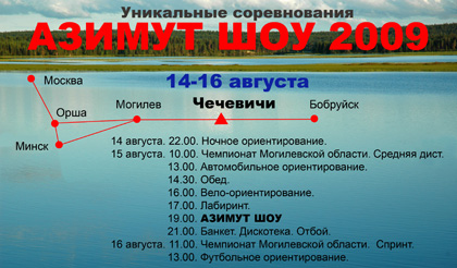 Приглашаем принять участие в соревнованиях по ориентированию "Азимут-шоу 2009". Это - уникальные соревнования в живописнейшем месте Беларуси! Солнце, огромное озеро, музыка и веселая компания доставят Вам незабываемое удовольствие. Все возможные и невозможные виды ориентирования за три дня. По сумме 4 видов проводится награждение призами. Размещение возможно как в палатках, так и в летних домиках.