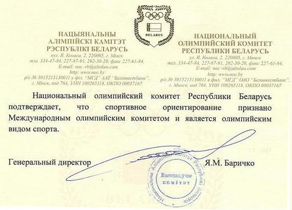 Заверил нас в этом Генеральный директор Национального олимпийского комитета Республики Беларусь Ярослав Михайлович Баричко. Таким образом, Национальный олимпийский комитет Республики Беларусь официально подтвердил, что спортивное ориентирование признано Международным олимпийским комитетом и является олимпийским видом спорта.